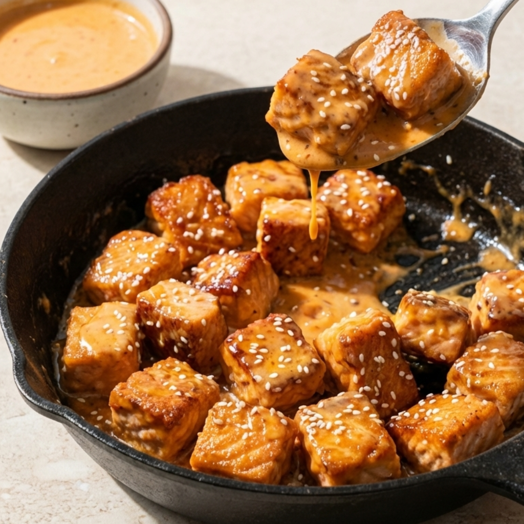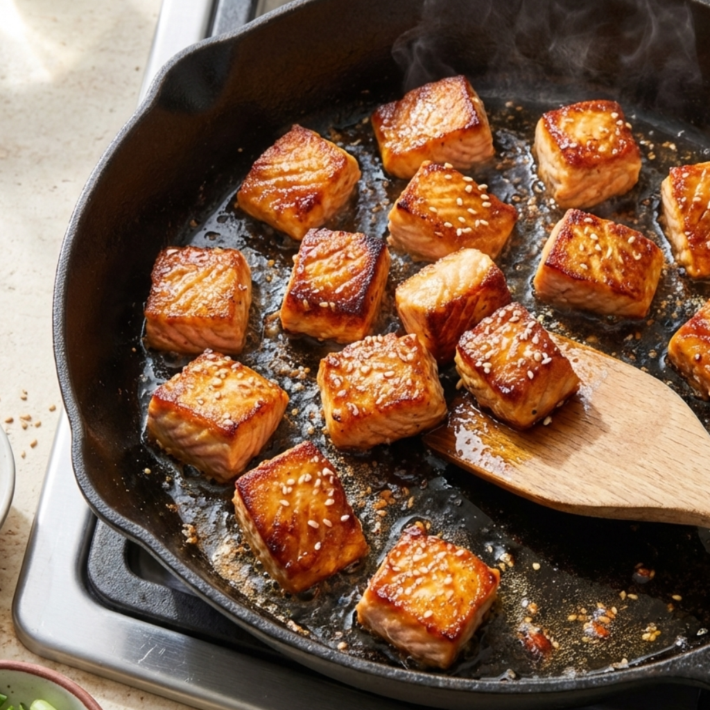 Cook the salmon bites in a single layer. If the salmon is crowded, it steams instead of crisps – cook in two batches if needed. Once the salmon is in, resist moving it for 2-3 minutes. Let it develop a golden crust. Flip gently and cook another 2-3 minutes on the other side. Total cook time is about 6-8 minutes and the salmon should be opaque in the center when done.
