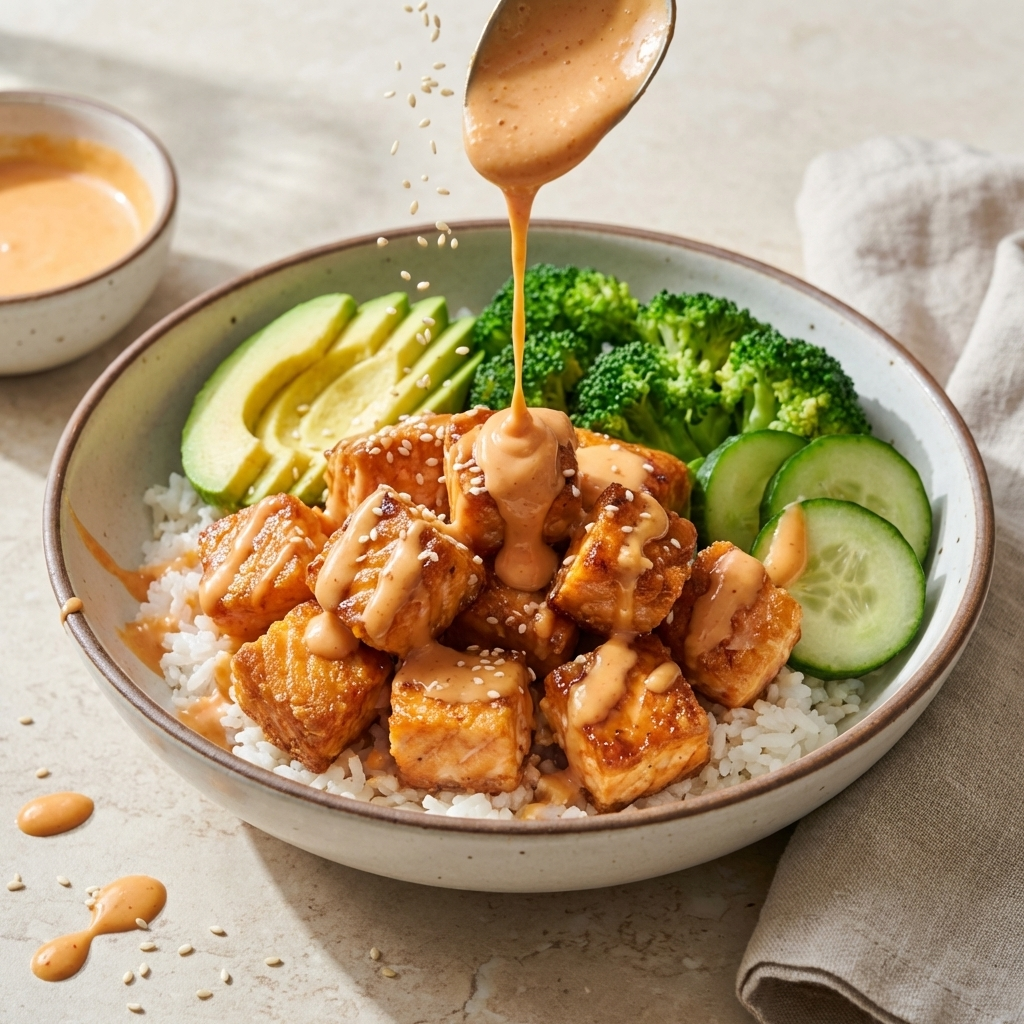 Let the pan cool slightly, then sauce the salmon. About 60 seconds off the heat is enough. Adding the sauce to a screaming hot pan can make it break and turn greasy. Add two-thirds of the bang bang sauce and toss gently to coat every piece. Save the rest for drizzling over the assembled bowls.