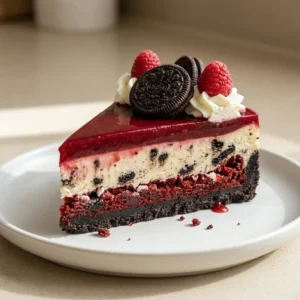 What makes this dessert so special is how it layers flavors and textures that just work together. You’ve got that dark, chocolatey Oreo crust giving you the perfect crunch, then a dreamy cream cheese layer studded with more Oreo pieces (because why not?), topped with red velvet cake crumbs, and finished with a glossy mirror glaze that catches the light like something out of a magazine spread.